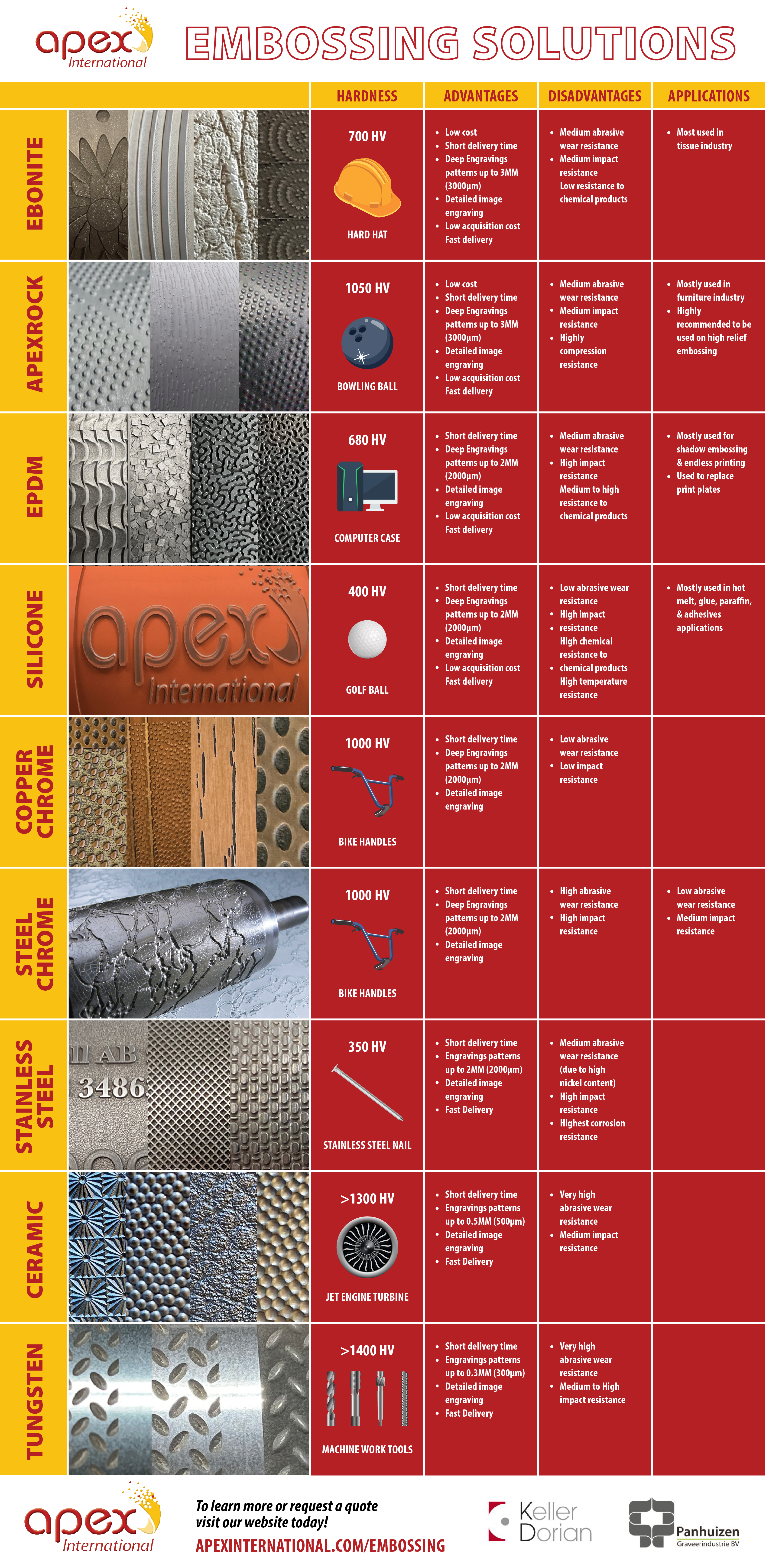 Apex International, through recent acquisitions, has the knowledge and capabilities to exceed your floor embossing goals. Our advanced, in-house manufacturing capabilities produce the highest quality rolls with minimal lead times. Our independent, full-service repro departments will collaborate with you to produce and proof your flooring pattern. And finally, our global service team will keep your embossers running at top speeds with optimal roll performance for your most profitable operations. Contact the Apex team to get started today!
